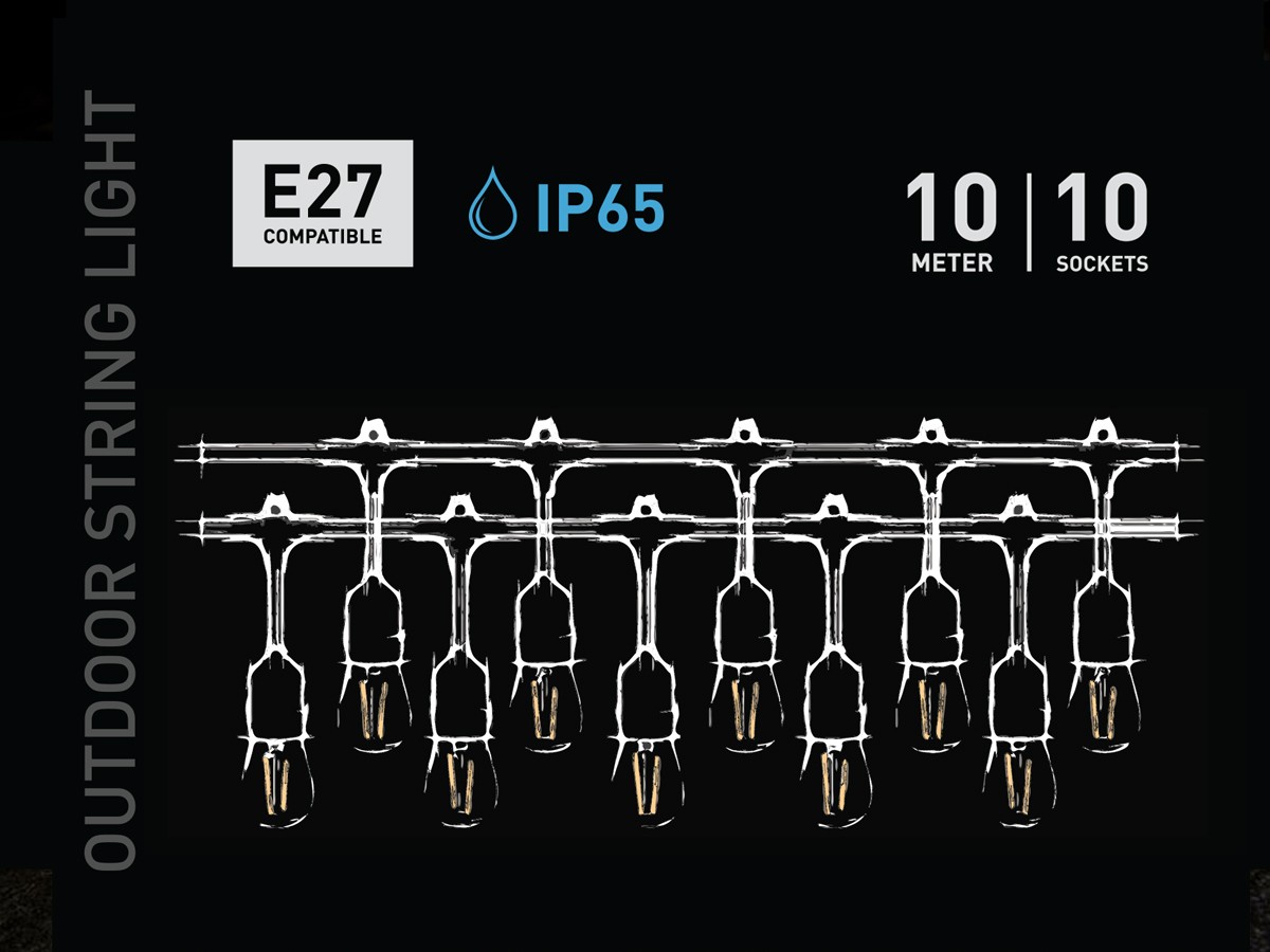 10 meters black light cord with 10 pieces of E27 fittings, thick cable, connectable – 2C x 1.5 mm – IP65 waterproof – with cord and plug – extendable with socket and light cords can be connected to each other – Party lighting for indoors and outdoors – lamps not included