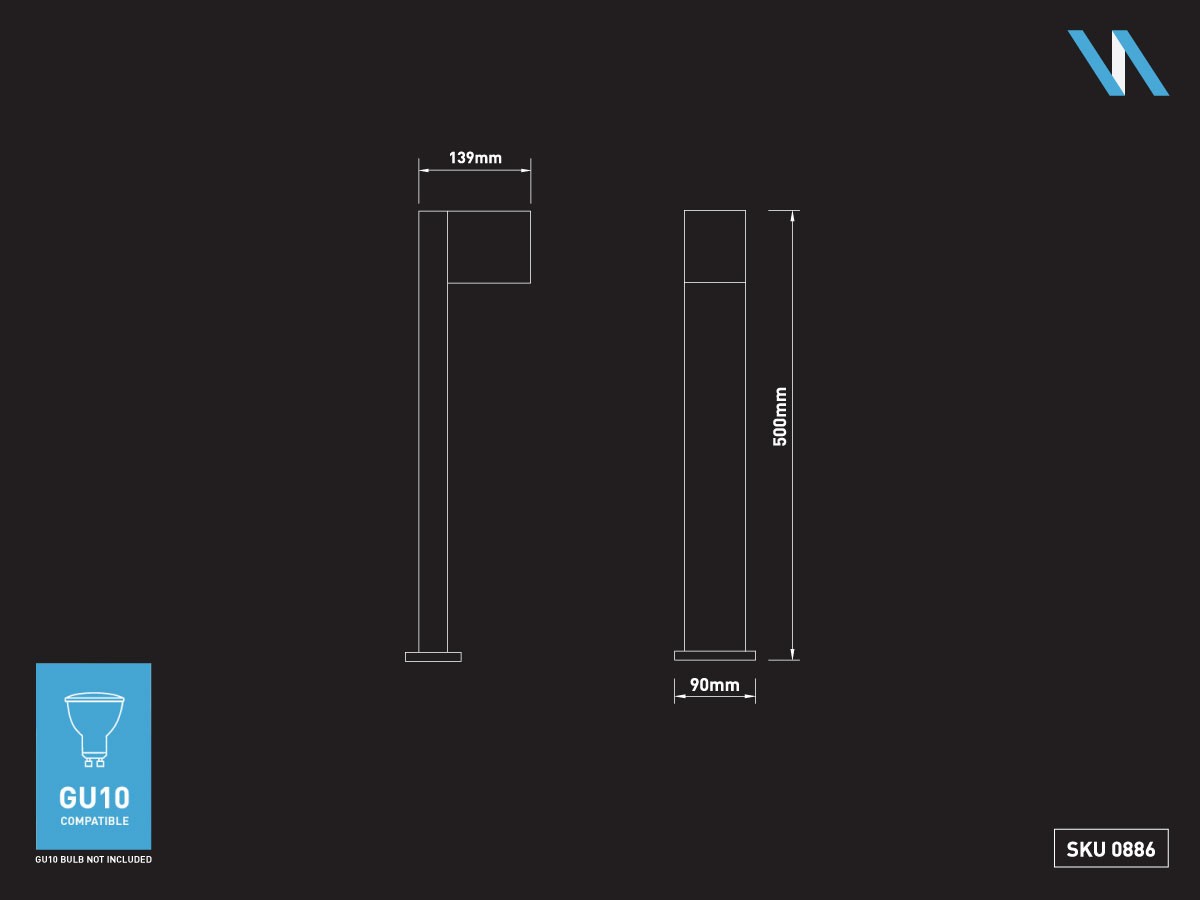 Garden lamp rectangular GU10 fitting sand black waterproof – IP44 waterproof – dimensions. 139 x 90 x 500mm – material aluminum and glass diffuser – mounting included – GU10 fitting – bulb not included – suitable for outdoors – one bulb input – voltage 220-240V – max 35 watts – cube fixed – Standing outdoor lamp
