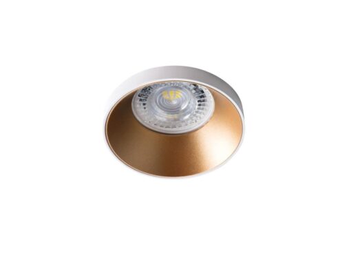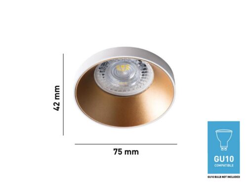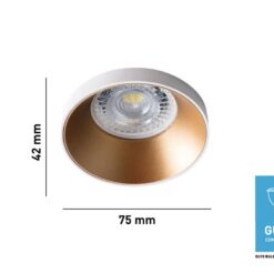 GU10 Recessed design fixture cylinder sand gold and white with lamp holder – seal IP20 – product color sand gold white – dimensions. Ø 75 x 42mm – installation diameter ø 60mm – material aluminum – fitting GU10 – including ceramic lamp holder – light source bulb not included – suitable for indoors – one bulb input – voltage 220-240V