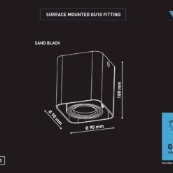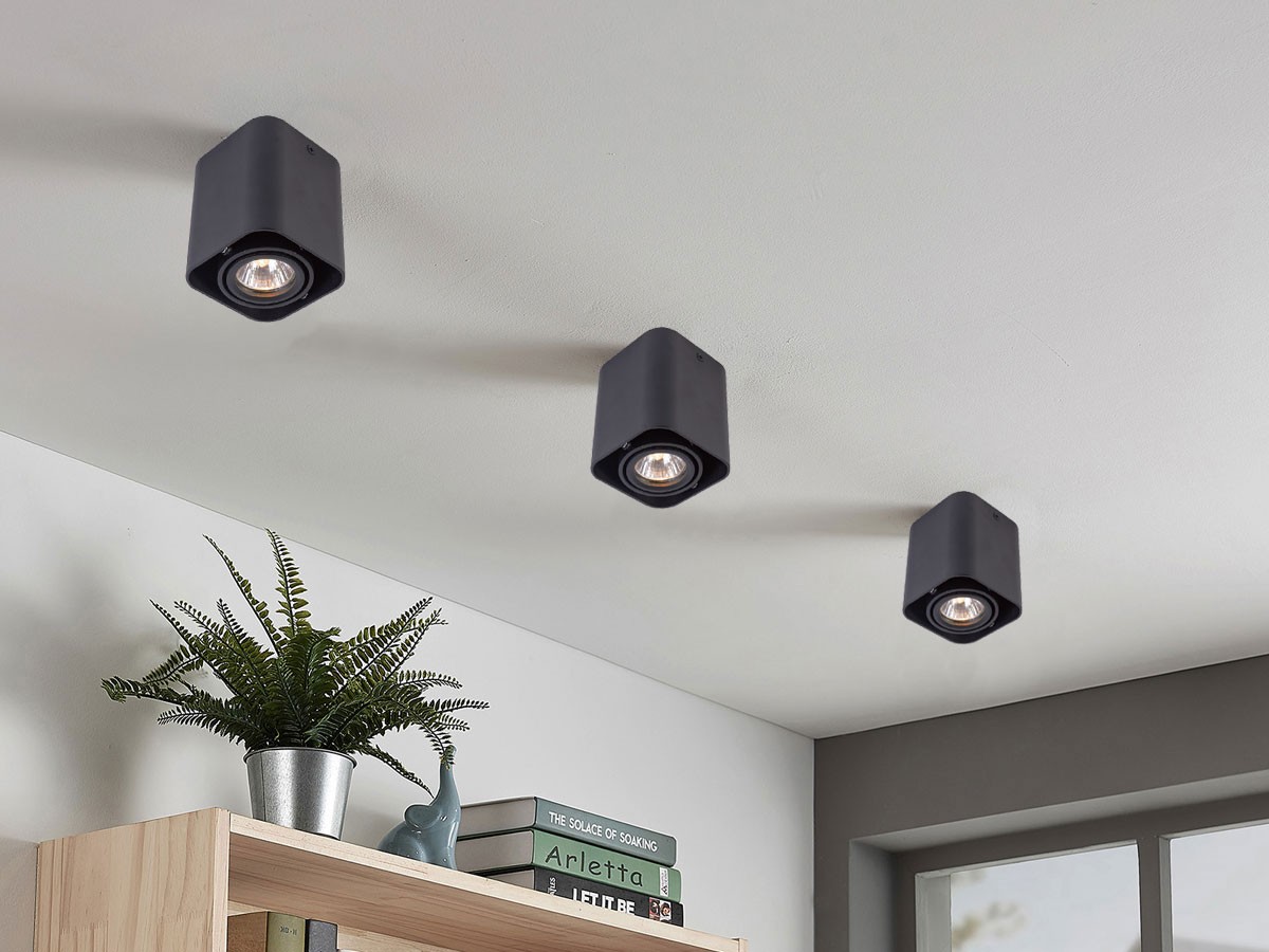 GU10 Surface-mounted spotlight fixture rectangular sand black tiltable – seal IP20 – product color sand black – dimensions. 90 x 90 x 100mm – mounting included – material aluminum – fitting GU10 – bulb not included – suitable for indoors – one bulb input – voltage 220-240V
