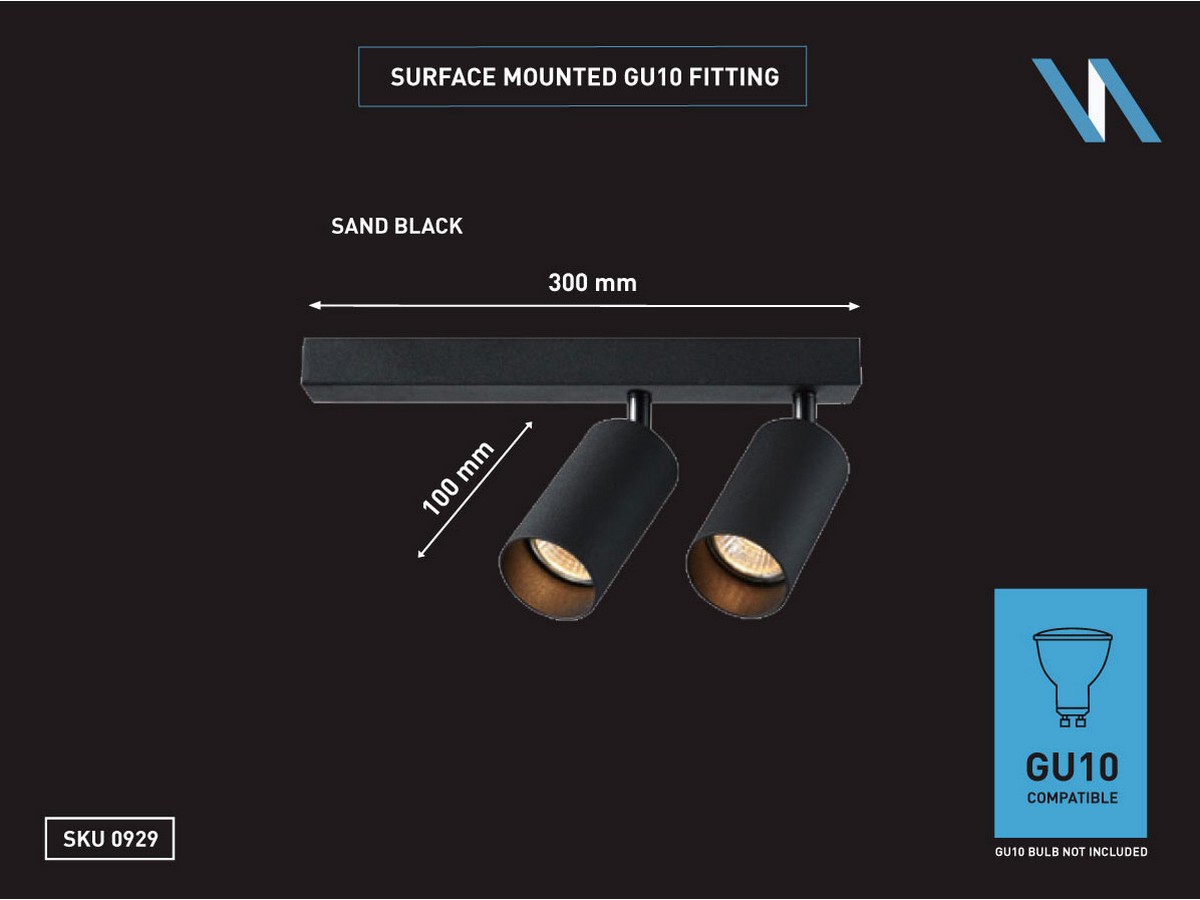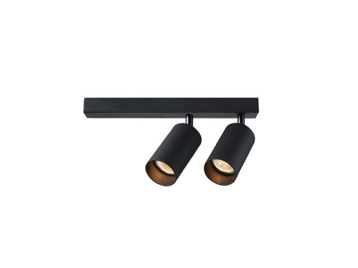 GU10 Surface-mounted spotlight fixture double cylinder sand black rotatable – seal IP20 – product color sand black – dimensions. Ø 55 x 100mm – dimensions wall holder 300 x 50mm – rotatable 350° and tiltable 90° – material aluminum and iron – mounting included – fitting GU10 – bulb not included – suitable for indoors – 2 x bulb input – voltage 220-240V – max 35 watt