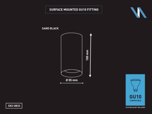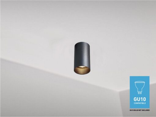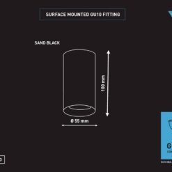 GU10 Surface-mounted spotlight fixture thin cylinder sand black – seal IP20 – product color sand black – dimensions. Ø 55 x 100mm – mounting included – material aluminum – fitting GU10 – bulb not included – suitable for indoors – one bulb input – voltage 220-240V