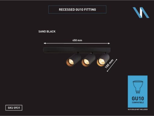 GU10 Surface-mounted spotlight fixture triple cylinder sand black rotatable – seal IP20 – product color sand black – dimensions. Ø 55 x 100mm – dimensions wall holder 450 x 50mm – rotatable 350° and tiltable 90° – material aluminum and iron – mounting included – fitting GU10 – bulb not included – suitable for indoors – 3 x bulb input – voltage 220-240V – max 35 watt