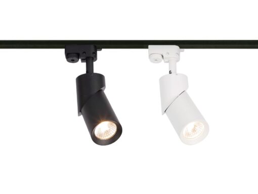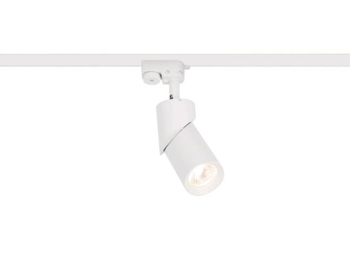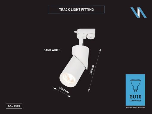 track light spot GU10 fixture cylinder sand white rotatable – suitable for 1 phase 2 wire track light – seal IP20 – product color sand white – dimensions. Ø 58.5 x 150mm – rotatable 350° and tiltable 180° – material aluminum and PC – mounting included – fitting GU10 – bulb and track not included – suitable for indoors – one bulb input – voltage 220-240V – max 35 watts